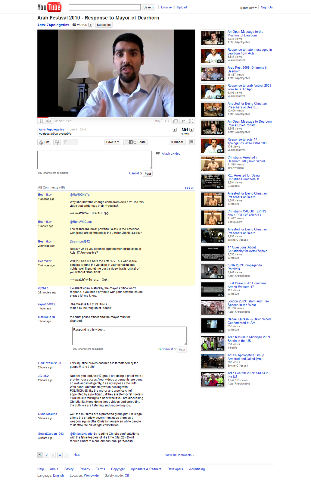 Dearborn Mayor and Dearborn Police, a few Muslims have evidence that Acts 17 Apologetics did cause quite a stir at the ISNA 2010 Conference at Chicago along with their co-conspirator Sam Shamoun. Kados to YouTuber & Blogger Yahya Snow!: